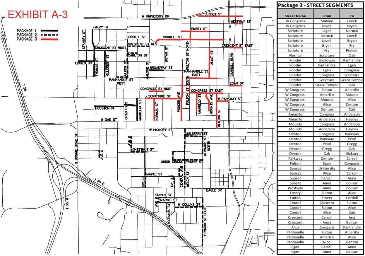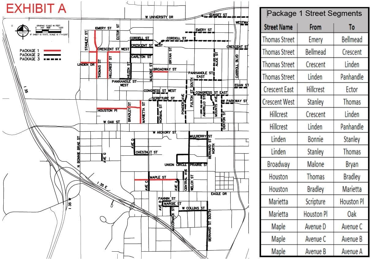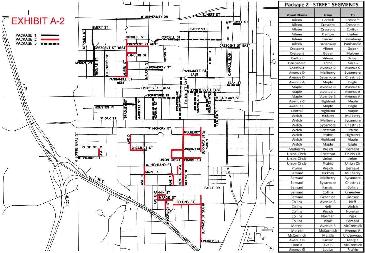 The 2019 Bond Neighborhoods 2 & 6 project is a part of a multi-phase street reconstruction project to rebuild existing streets that have reached the end of their useful life. Maps are provided to left (or bottom) for all streets that will be part of the Neighborhood 2 & 6 project as well as the breakdown of the phases (Packages 1, 2 & 3). Street reconstruction will include new curb and gutter, asphalt/concrete roadways and upgrading select water and/or wastewater facilities. There will be some areas of sidewalk and street lighting replacement and areas of new lighting & sidewalk.