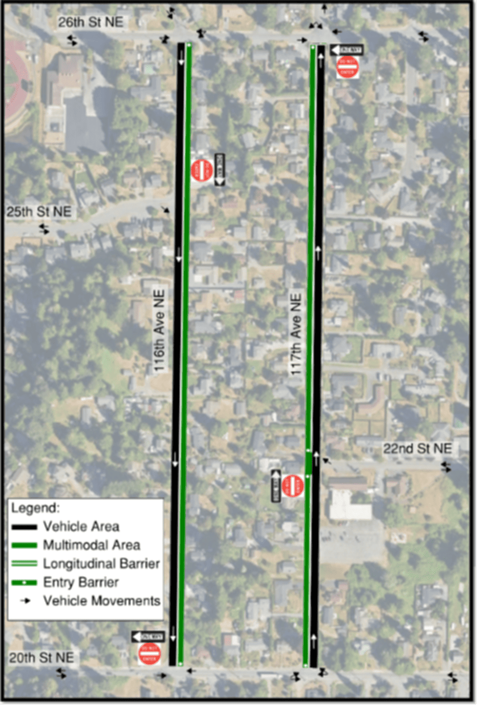 There is no existing pedestrian infrastructure on 116th or 117th Avenue NE, and many requests to calm traffic. The TBP was passed to help pedestrians, and to put sidewalks on 117th and other locations. But not 116th, which would lack sidewalks for many more years. To be conscious of your tax dollars and time, the city is innovating with other methods to build a transportation network for pedestrians, and build more walkable streets faster. As this is a novel experiment, your involvement and feedback will be crucial to make this project attentive to your needs, and will lay the groundwork for future methods to build pedestrian first infrastructure faster and more cost efficient.