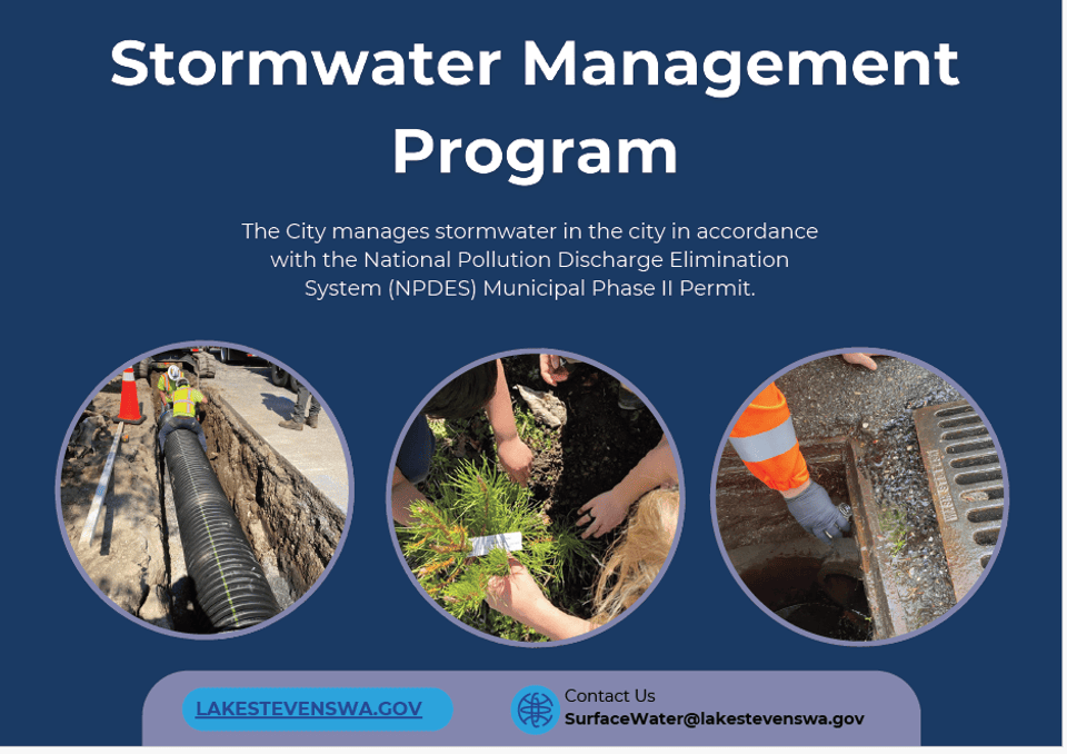 As Lake Stevens continues to grow, so does our responsibility to protect the natural beauty and health of our community's water resources. Increased development means more hard surfaces like roads, parking lots, and rooftops, which prevent rainwater from naturally soaking into the ground. This rainwater, known as stormwater runoff, often picks up pollutants like oils, dirt, and chemicals as it flows into our lakes and streams. To address these challenges, the City follows the guidelines of the NPDES Municipal Phase II Permit by implementing a comprehensive set of tools, programs, and outreach efforts that work to reduce pollution and safeguard the environment.