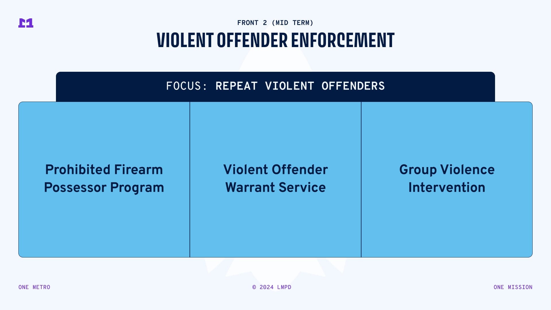 - Violent Offender Enforcement: Focuses collaborative resources and partnerships on apprehension of the most violent people in the community, seizures of illegally possessed firearms, successful prosecutions, and reduced recidivism. This plan also focuses on providing resources and services to those who are associated with group violence and looking to change their lifestyle.
