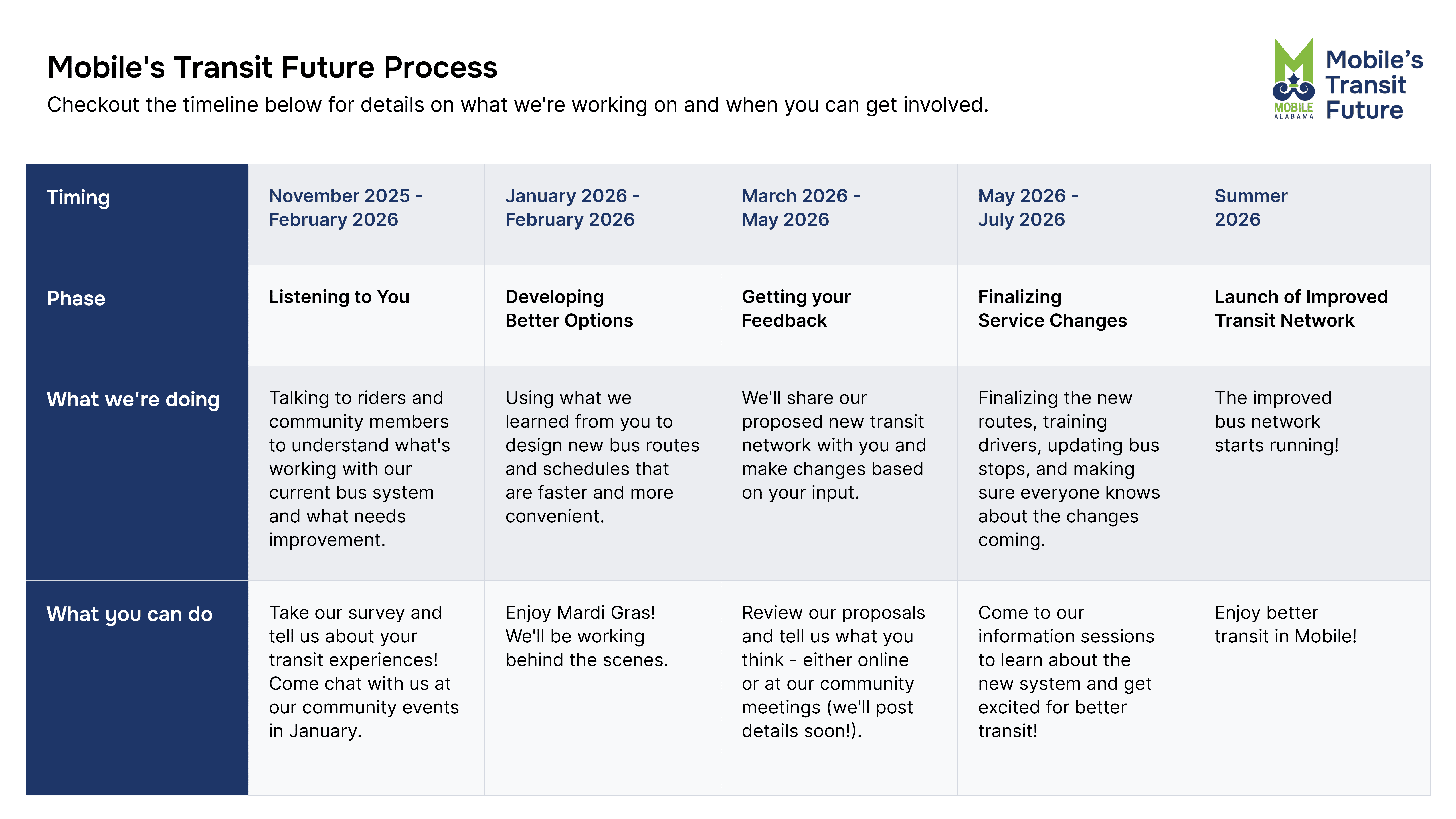 Check back soon for opportunities to provide feedback and help to shape Mobile’s Transit Future.