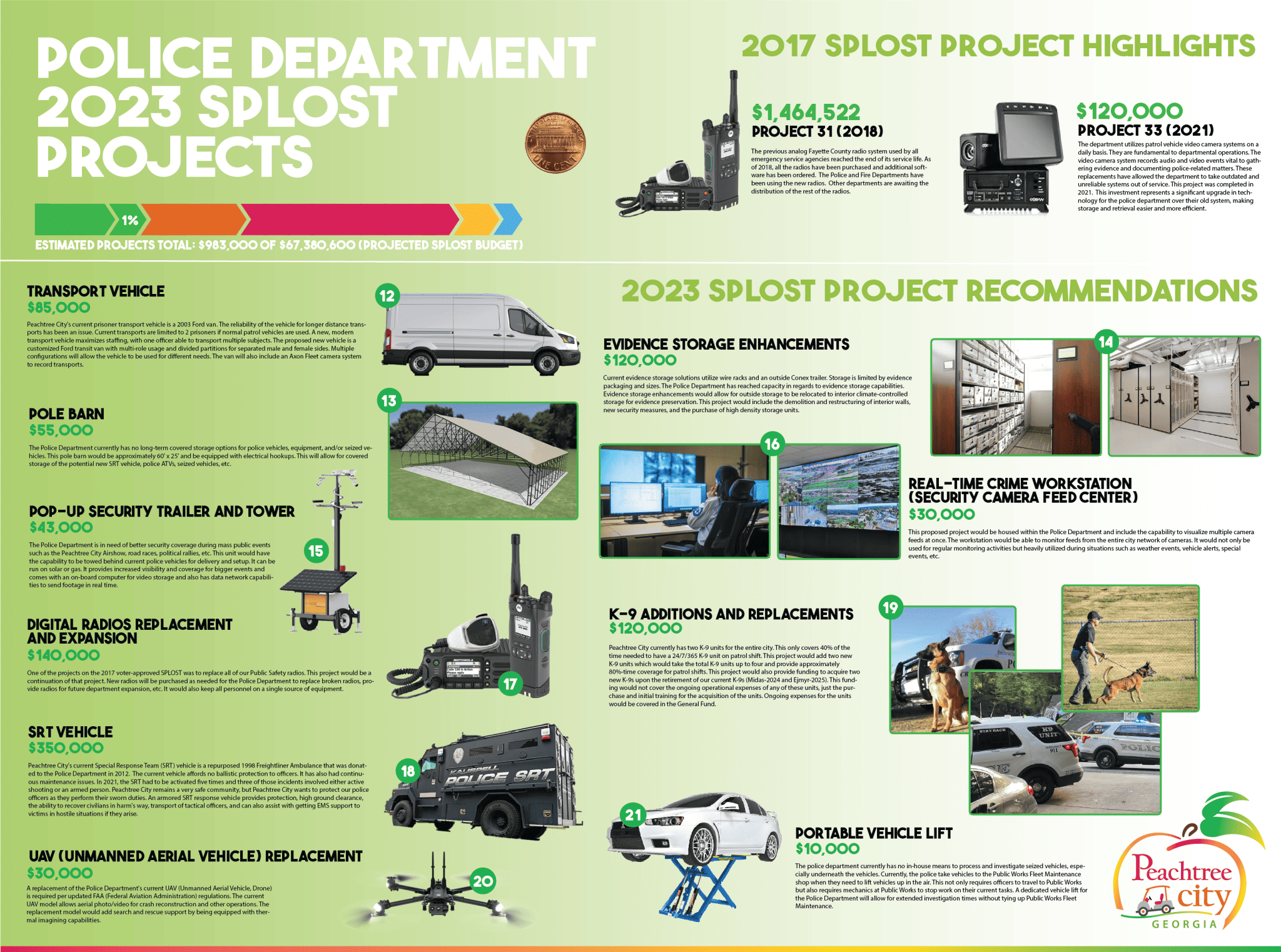 More information pertaining to the 2017 SPLOST can be found by visiting: 2017-SPLOST-Information https://peachtreecity-ga.civilspace.io/en/projects/2017-splost-information