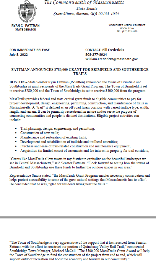 Please see the link under "Supporting Documents" section (to the right) of this page to view Massachusetts Senator Ryan Fattman's announcement of the $500,000 MassTrails grant awarded to the Town of Southbridge.
