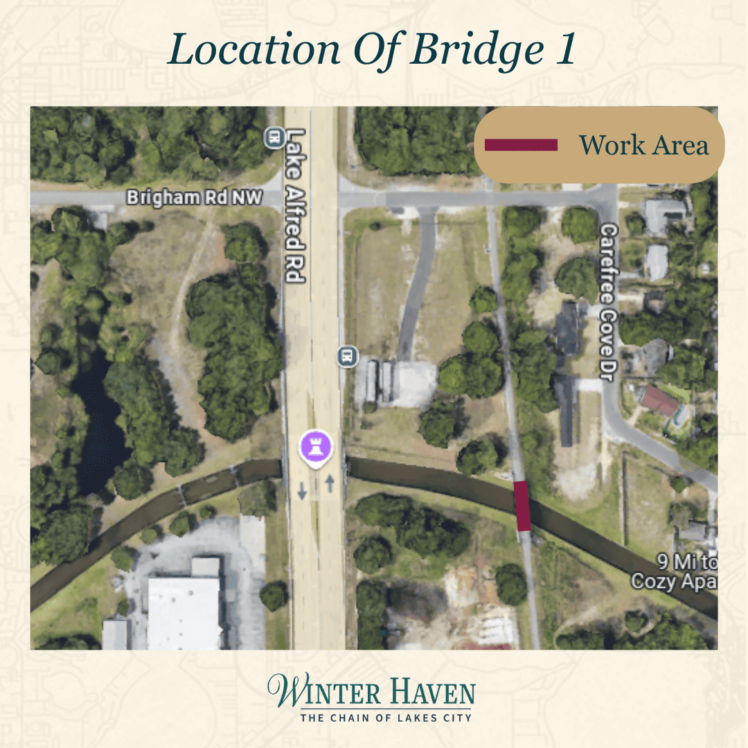 • Bridge 1 is located just north of the Conine & Hartridge Canal, south of Carefree Cove Drive, and east of Highway 17.