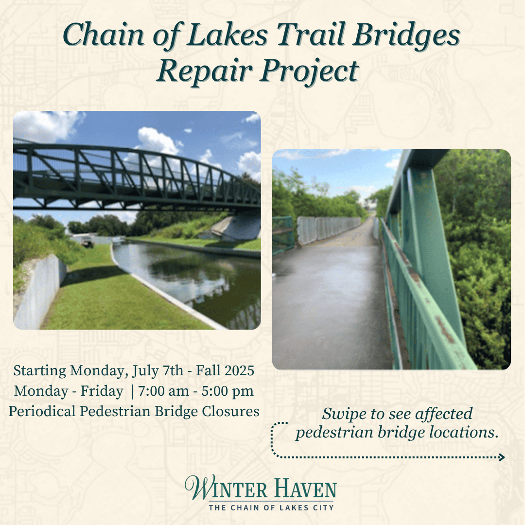 Pedestrian bridge maintenance will be performed on two bridges along the Chain of Lakes Trail beginning July 7, 2025. Work will take place Monday through Friday, from 7:00 AM to 5:00 PM. Temporary closures of the bridges may occur throughout the project to ensure public safety as crews work.