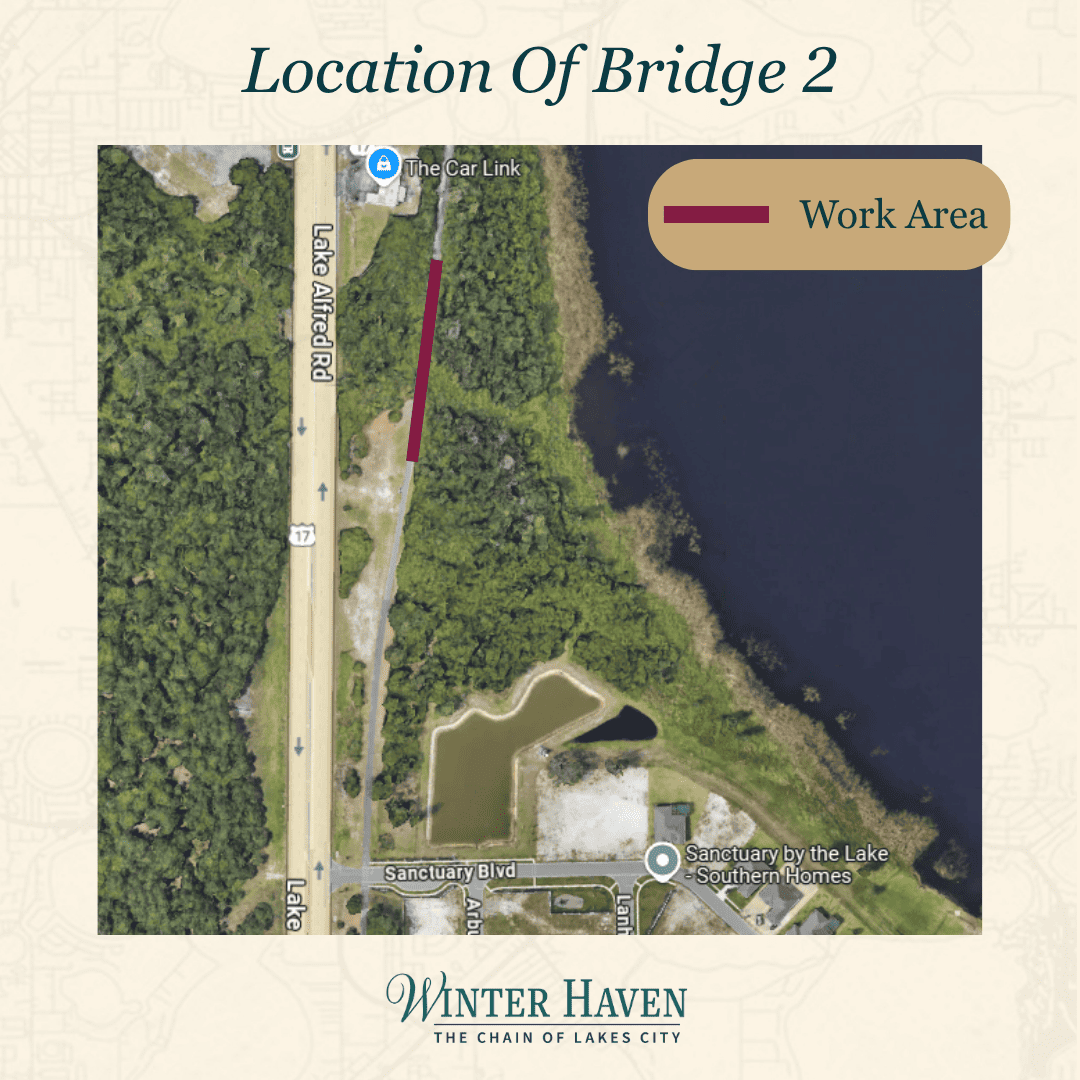 • Bridge 2 is located just north of Sanctuary Boulevard, crossing the canal that connects to the west side of Lake Rochelle.